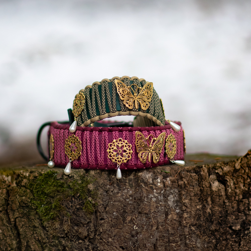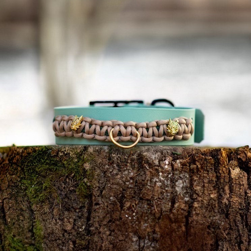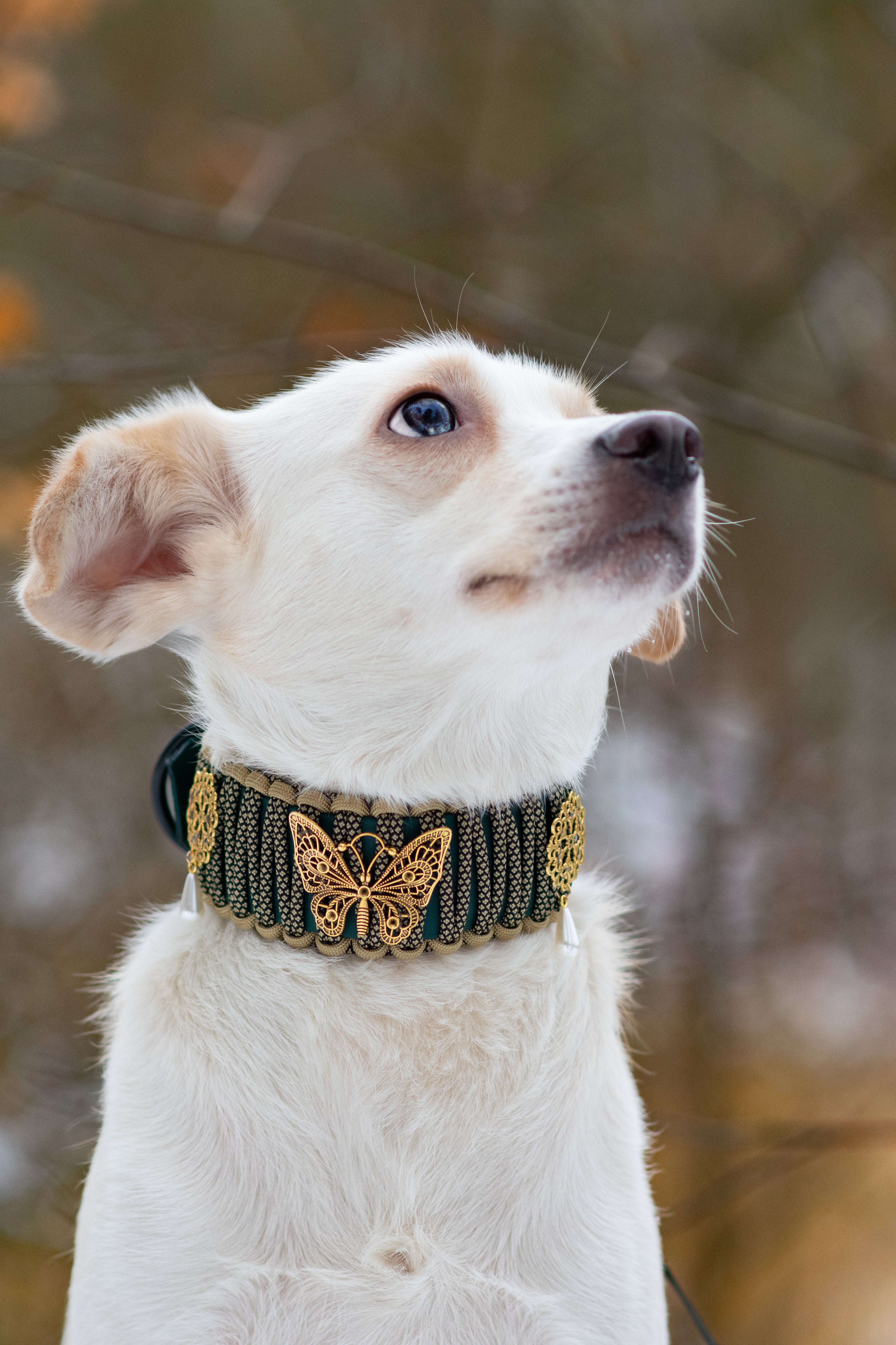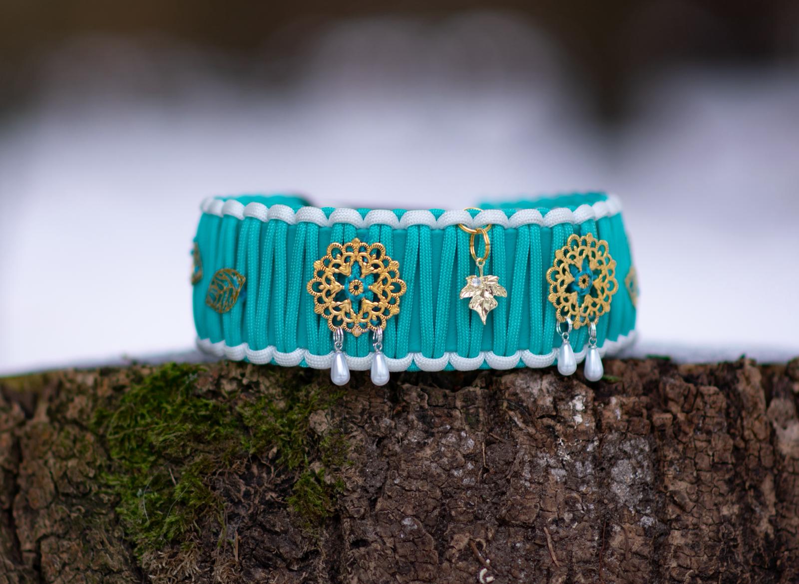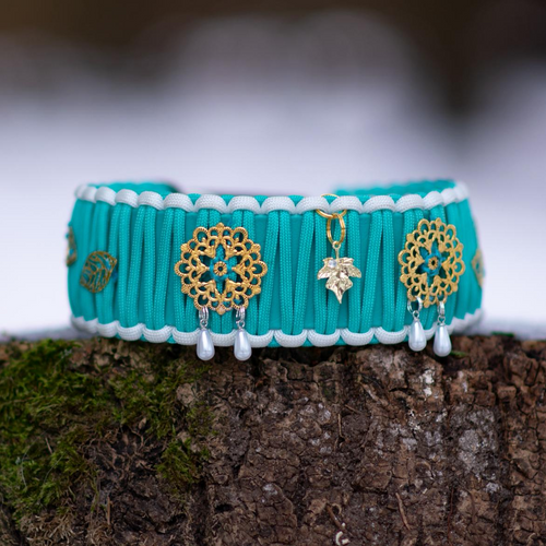 Das Grundgerüst besteht aus Biothane, zusätzlich werden die Halsbänder mit Paracord und Schmuckelementen aus verschiedenen Materialien veredelt.